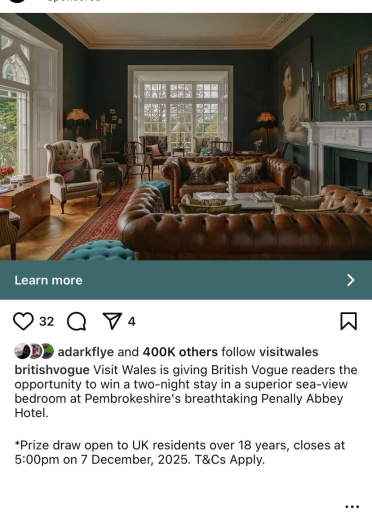 Lansiwyd ein hymgyrch Hydref ym mis Medi drwy gyfres o bartneriaethau cyfryngau proffil uchel. Bydd cydweithrediadau â Cool Stays, British Vogue, Women & Home, RSPB, a Wanderlust yn targedu ein cynulleidfaoedd craidd drwy hysbysebion print a chynnwys digidol a chymdeithasol deinamig, gan adeiladu mwy o ymwybyddiaeth o Gymru fel prif gyrchfan gwyliau byr.